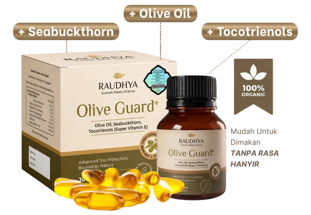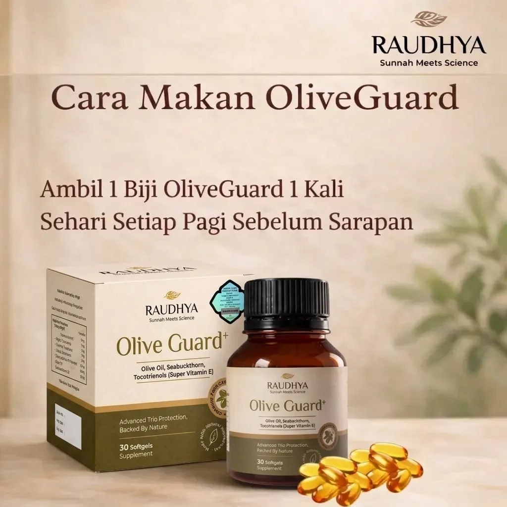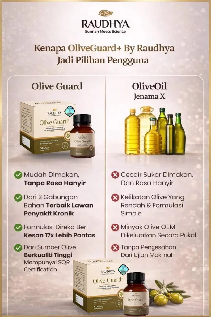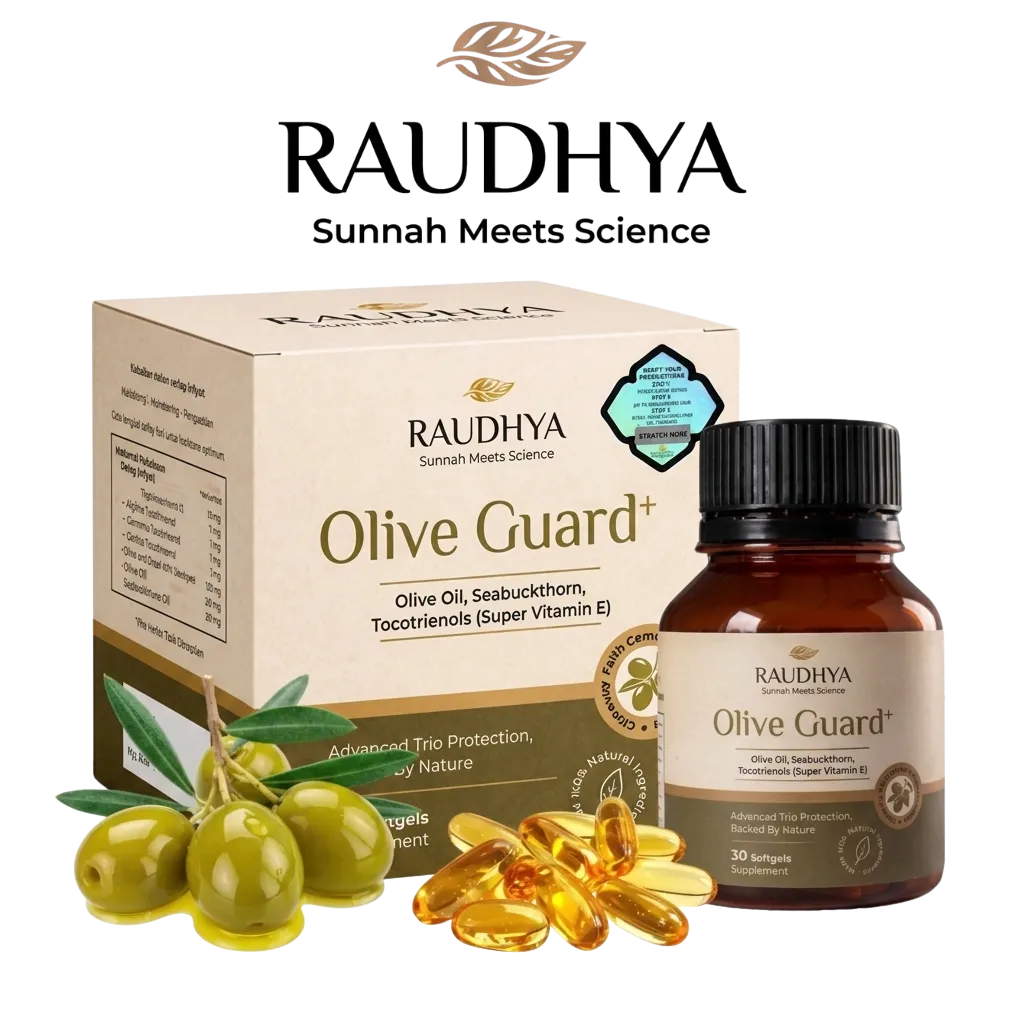 Raudhya OliveGuard+ Diperkaya Bahan Aktif Polyphenols, Tocotrienols (Super Vitamin E) & Omega Aktif Menyokong Kawalan Gula, Kolesterol & Tekanan Darah