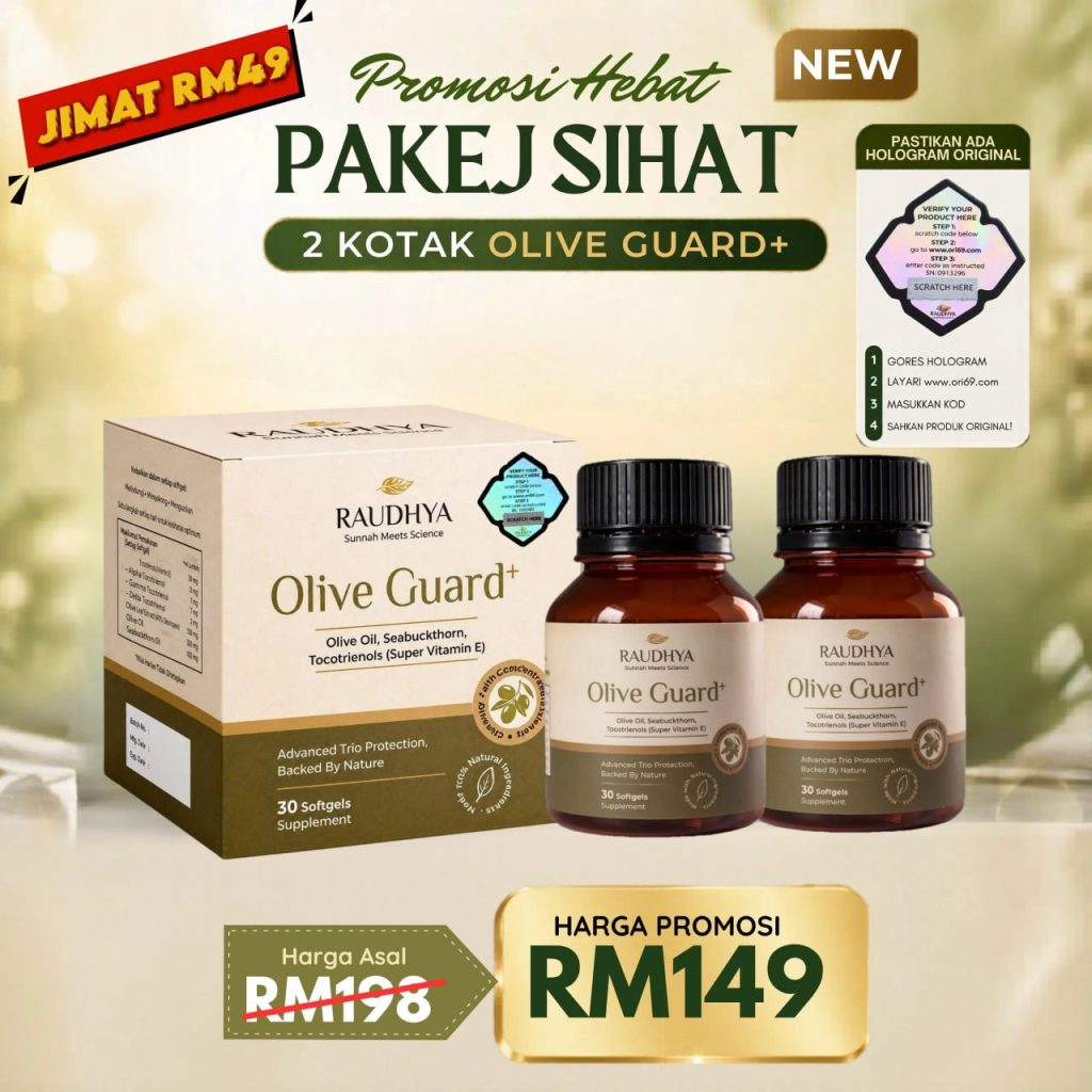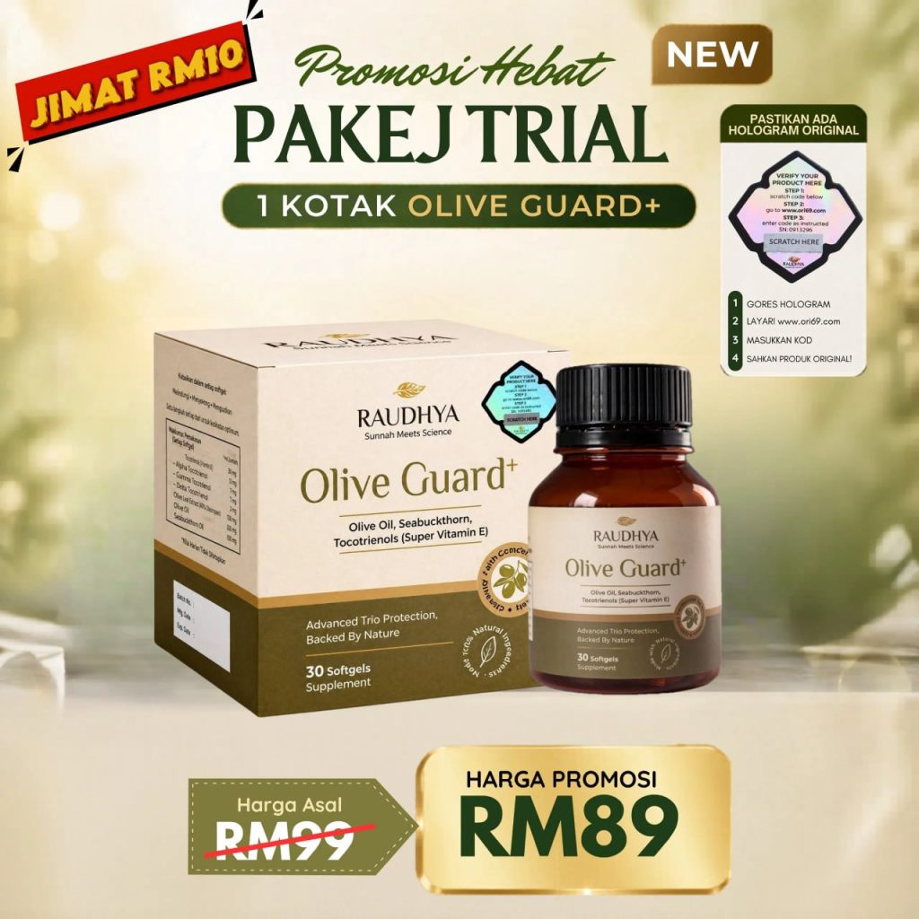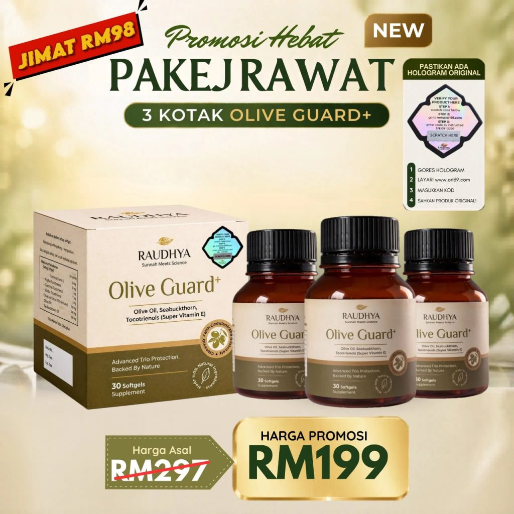Raudhya OliveGuard+ Diperkaya Bahan Aktif Polyphenols, Tocotrienols (Super Vitamin E) & Omega Aktif Menyokong Kawalan Gula, Kolesterol & Tekanan Darah
